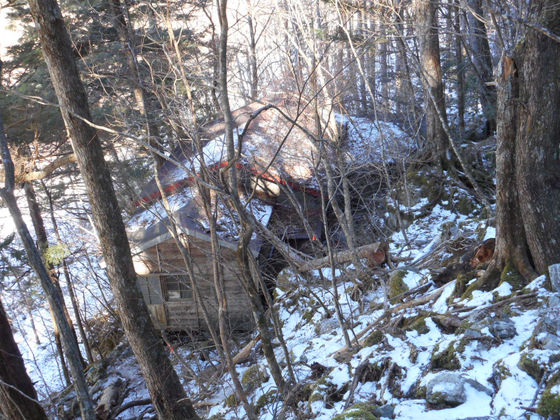 入山したときには遠目に見た廃屋、なぜか下山時は近くを歩いてしまった。真ん中に玄関があるけど玄関前に土が無いじゃん。ここも川にえぐられたってことかな。